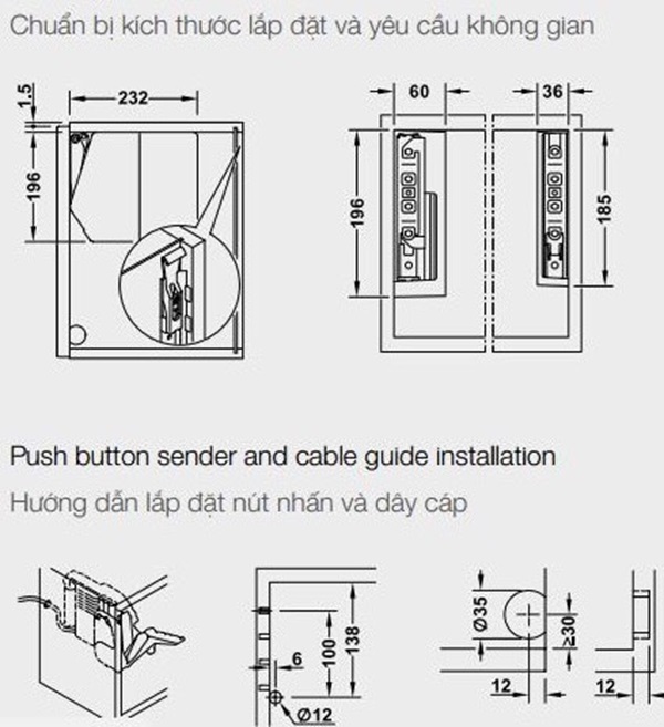 - Chiều rộng cánh tủ: <1.200 mm (>1.200 mm = 2 bộ)