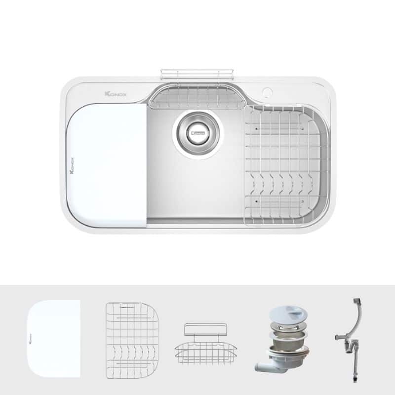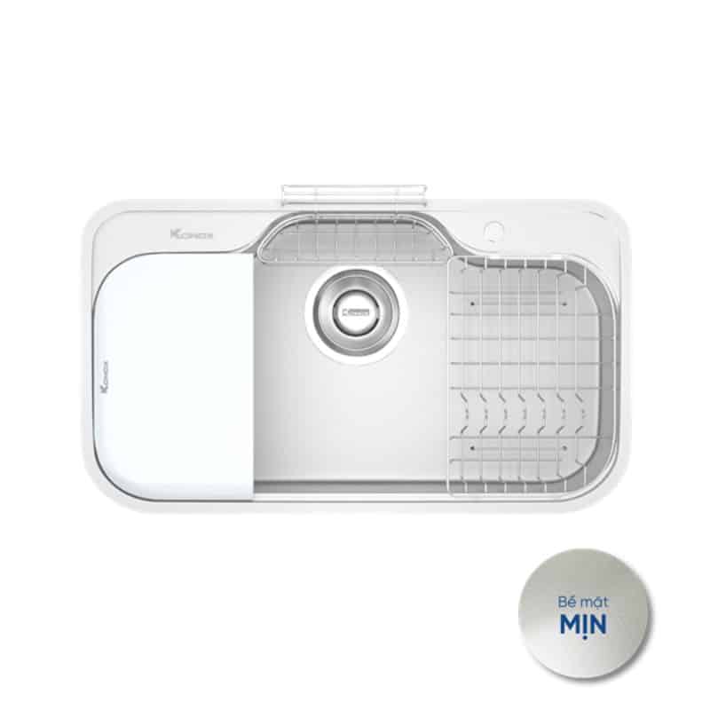 - Tích hợp phụ kiện thông minh: Thớt nhựa, rổ phụ, giá úp bát, siphon