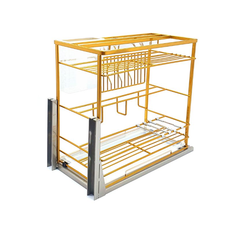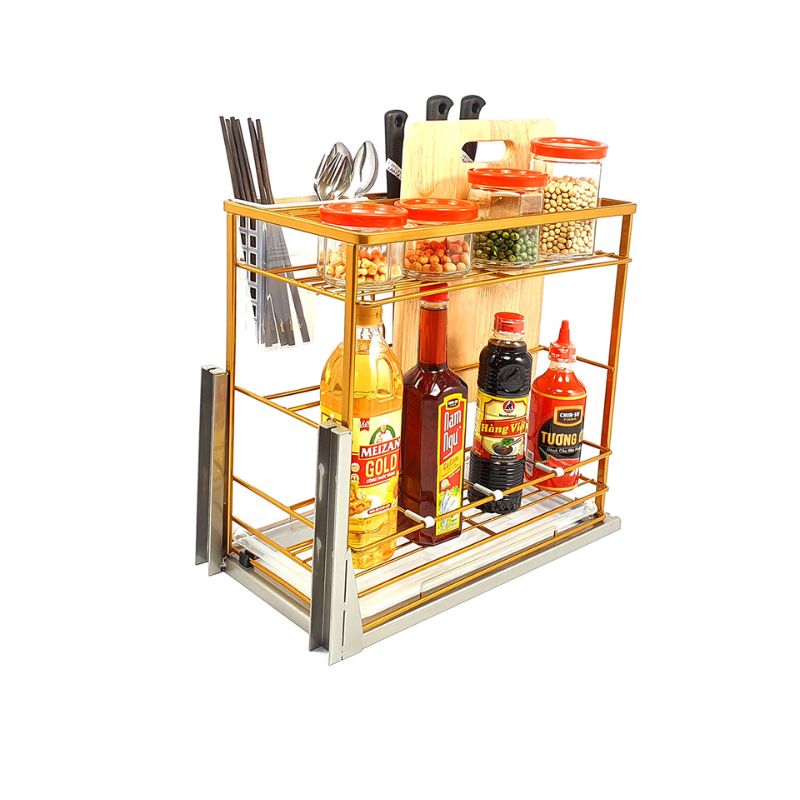 - Công năng: Thiết kế thành 2 tầng, mỗi tầng được chia thành các khay, ngăn khác nhau. Các vật dụng khi được để vào đúng vị trí phù hợp, giúp chúng luôn được an toàn, không bị rơi vỡ, và cũng giúp cho chủ nhân luôn tìm ra chúng một cách nhanh nhất. Với thiết kế âm tủ thông minh, giúp các bé nhà bạn tránh xa khỏi các đồ vật có phần nguy hiểm như dao, kéo, chai lọ dễ vỡ. Ray giảm chấn cao cấp được tích hợp giúp chuyển động vô cùng mượt mà, không gây tiếng ồn. Cuối cùng, không thể phủ nhận vẻ đẹp sang trọng, đẳng cấp mà phụ kiện tủ bếp thông minh này mang đến cho không gian bếp nhà bạn.