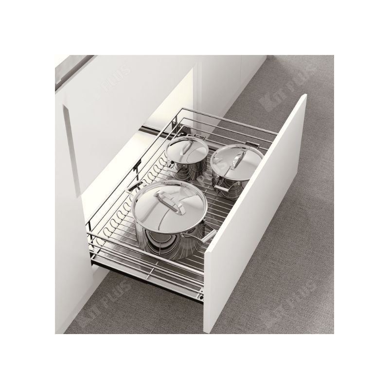 Giá xoong nồi nan tròn Inox mờ, ray giảm chấn Kit Plus DG80S