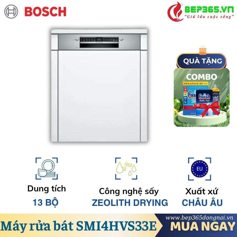 Máy rửa bát Bosch SMI4HVS33E thiết kế lắp âm tiết kiệm diện tích không gian bếp, công suất rửa 13 bộ tiện dụng, hoạt động siêu êm với độ ồn cực thấp. Liên hệ HOTLINE (24/7) để được hỗ trợ tư vấn và NHẬN GIÁ ƯU ĐÃI trong chương trình khuyến mại mới nhất của Bếp 365.