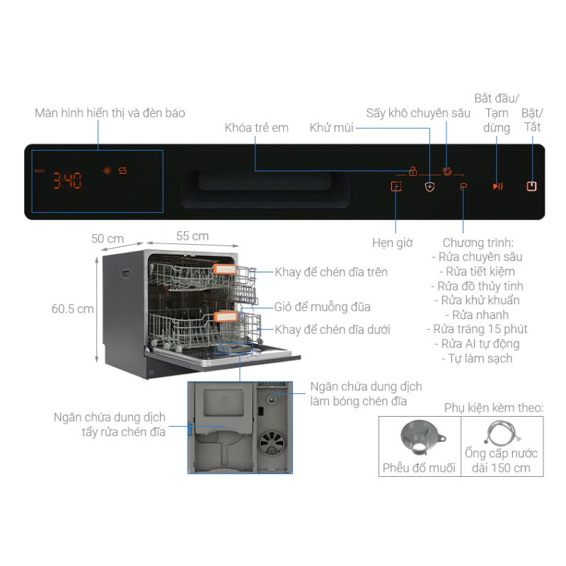 - Hẹn thời gian từ 1 giờ đến 24 giờ, giúp người dùng linh động sắp thời gian làm việc một cách hợp lý, đồng thời tiết kiệm điện năng hơn khi để máy rửa vào ban đêm.