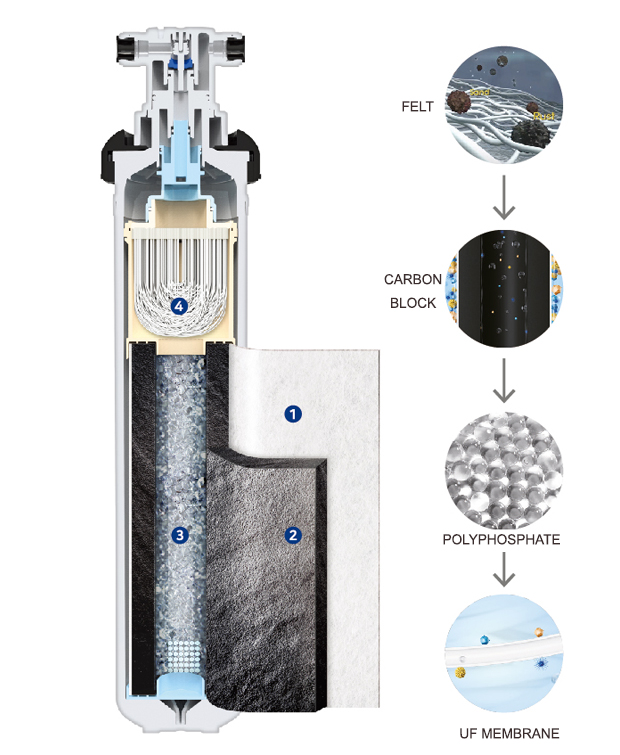 - UF MEMBRANE – Bộ lọc đúc nguyên khối sử dụng vật liệu màng sợi rỗng có khả năng loại bỏ các chất ô nhiễm có kích thước từ 0.1 – 0.01µm như vi khuẩn, E-Coli, nang bào, chất rắn, kim loại nặng, những chất gây hại đến sức khỏe con người.